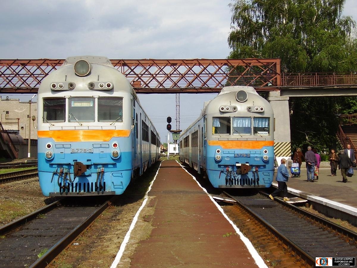 | "Братья". Дизель-поезда Д1-778 и Д1-779 на станции Попасная, Луганская обл. Автор: ВН Цокур | Фото сделано 4.VI.2008, опубликовано 1.III.2009.
