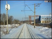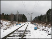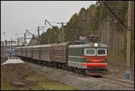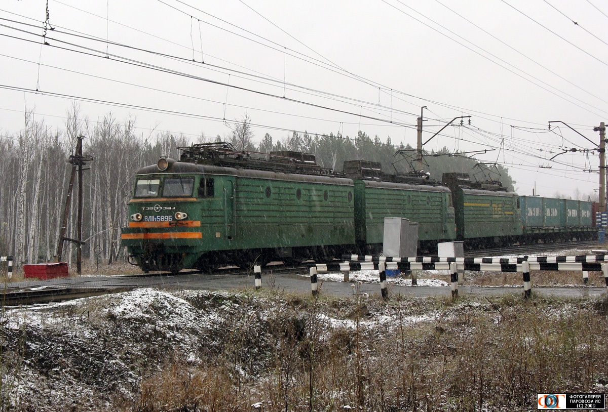 | Электровоз ВЛ11.8-589/590А с составом на переезде с автодорогой в пос. Шувакиш, перегон Шувакиш - Свердловск-Сортировочный, Свердловская обл. Автор: M7 | Фото сделано 24.X.2009, опубликовано 29.X.2009.