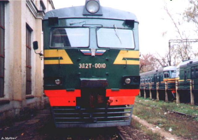 | Электропоезд ЭД2Т-0010 { ED2T-0010 EMU train }, депо Перерва { Pererva shed }, Москва Автор: 268 | Фото сделано X.2001, опубликовано 26.XI.2001.