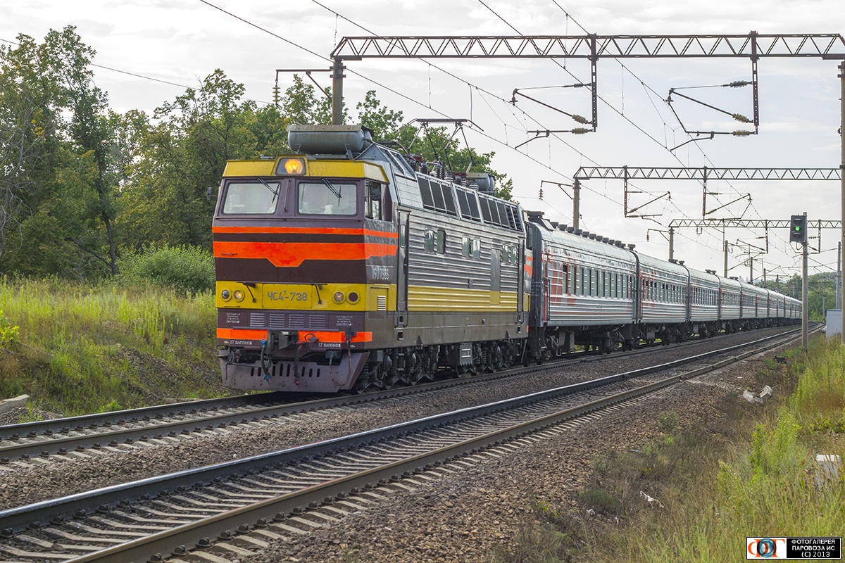 | Электровоз ЧС4Т-738 с поездом, перегон Новохопёрск - Половцево, Воронежская обл. Автор: Анатолий Нагорнов | Фото сделано 26.VII.2013, опубликовано 21.VIII.2013.