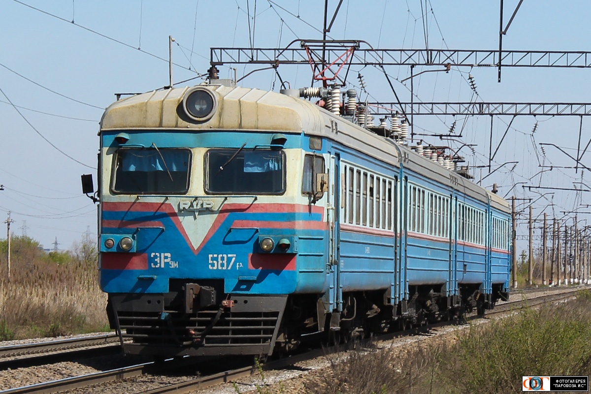 | Электропоезд ЭР9М-587 на перегоне Май-Кудук (Майкудук) - Жана Караганды, Карагандинская область Автор: motowoz | Фото сделано 7.V.2016, опубликовано 13.V.2016.