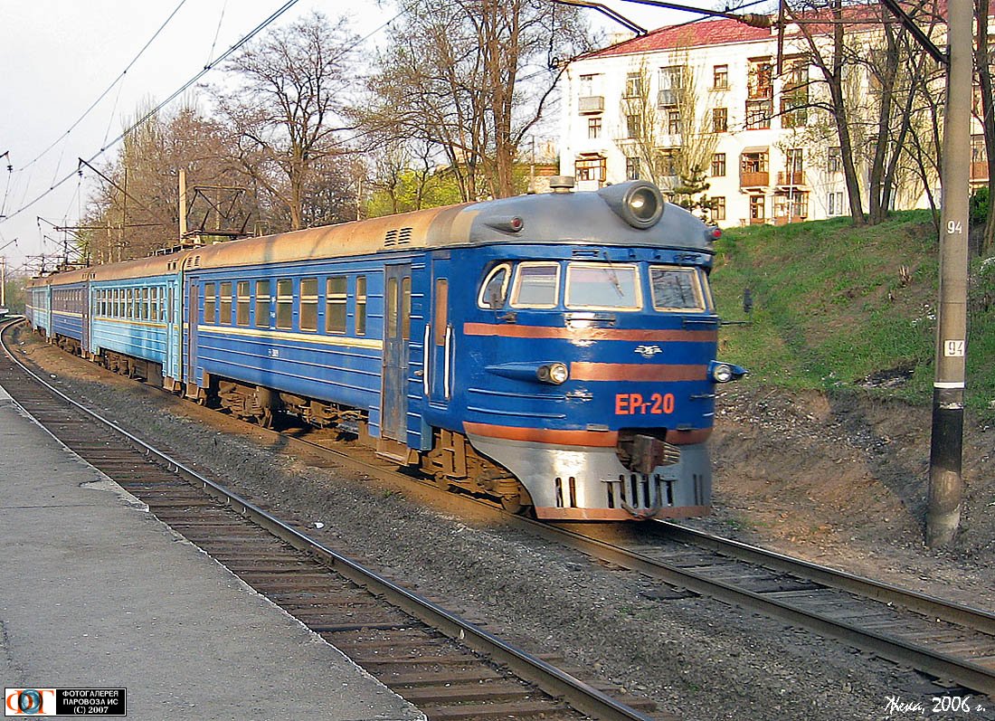 | Электропоезд ЭР1-20, пл. 174 км, перегон Запорожская Сечь - Запорожье-Малое (ныне Имени Анатолия Алимова), Запорожская обл. Автор: Hunter | Фото сделано 23.IV.2006, опубликовано 26.IX.2007.
