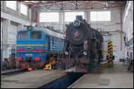 Паровоз Л-0282 и секция Б тепловоза 2М62-0849 в паровозном цехе депо Калининград