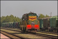 Тепловоз ЧМЭ3-2118 с грузовым составом подъезжает к станции Пирит