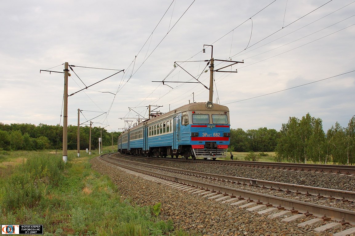 | Электропоезд ЭР9Т-682 на перегоне Татищево - Курдюм, Саратовская обл. Автор: Айдаров Д. | Фото сделано 23.VI.2007, опубликовано 5.X.2007.