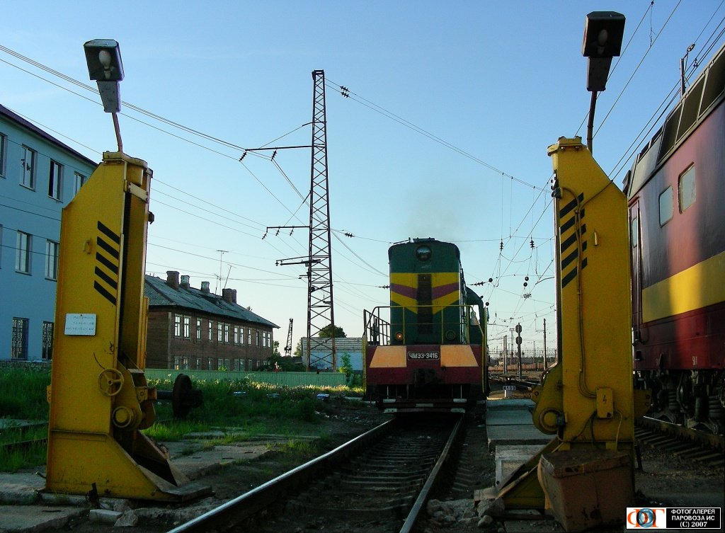 | Домкраты для смены колесных пар и тепловоз ЧМЭ3-3416, ст. Данилов, Ярославская обл. Автор: Ирина | Фото сделано 3.VI.2007, опубликовано 8.XI.2007.