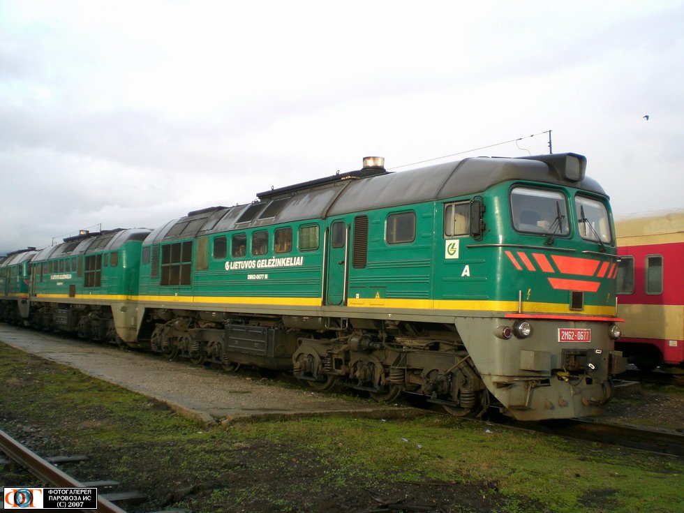 | Тепловоз 2М62-0677М с тюнинговаными трубами, депо Клайпеда, Литва Автор: Эймантас | Фото сделано 26.XI.2007, опубликовано 28.XI.2007.