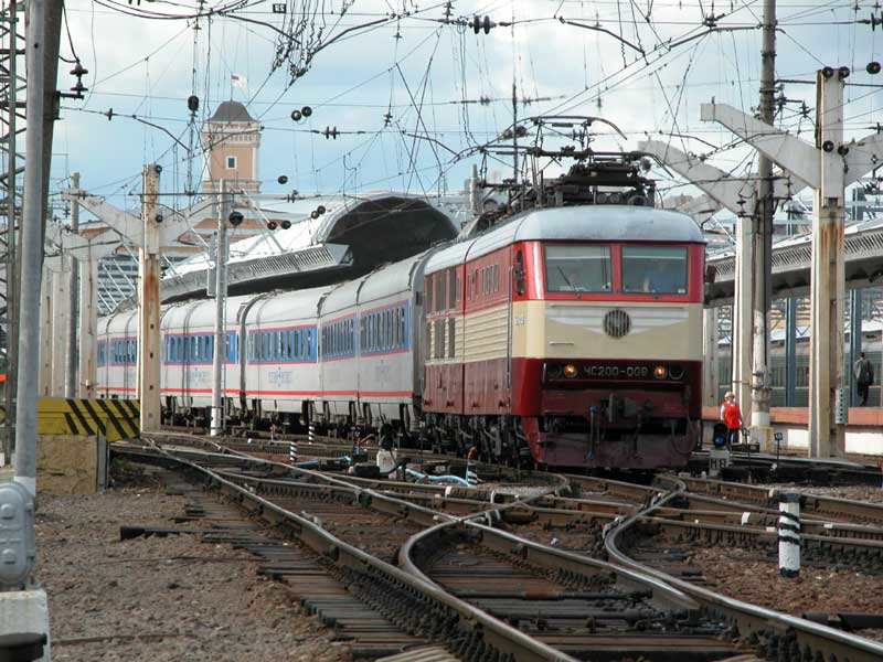 | Электровоз ЧС200-009 { ChS200-009 electric locomotive }, С.-Петербург-Моск. { St.Petersburg-Mosk. }, Санкт-Петербург Автор: Уормалд Ф. | Фото сделано 16.VI.2003, опубликовано 14.VII.2003.