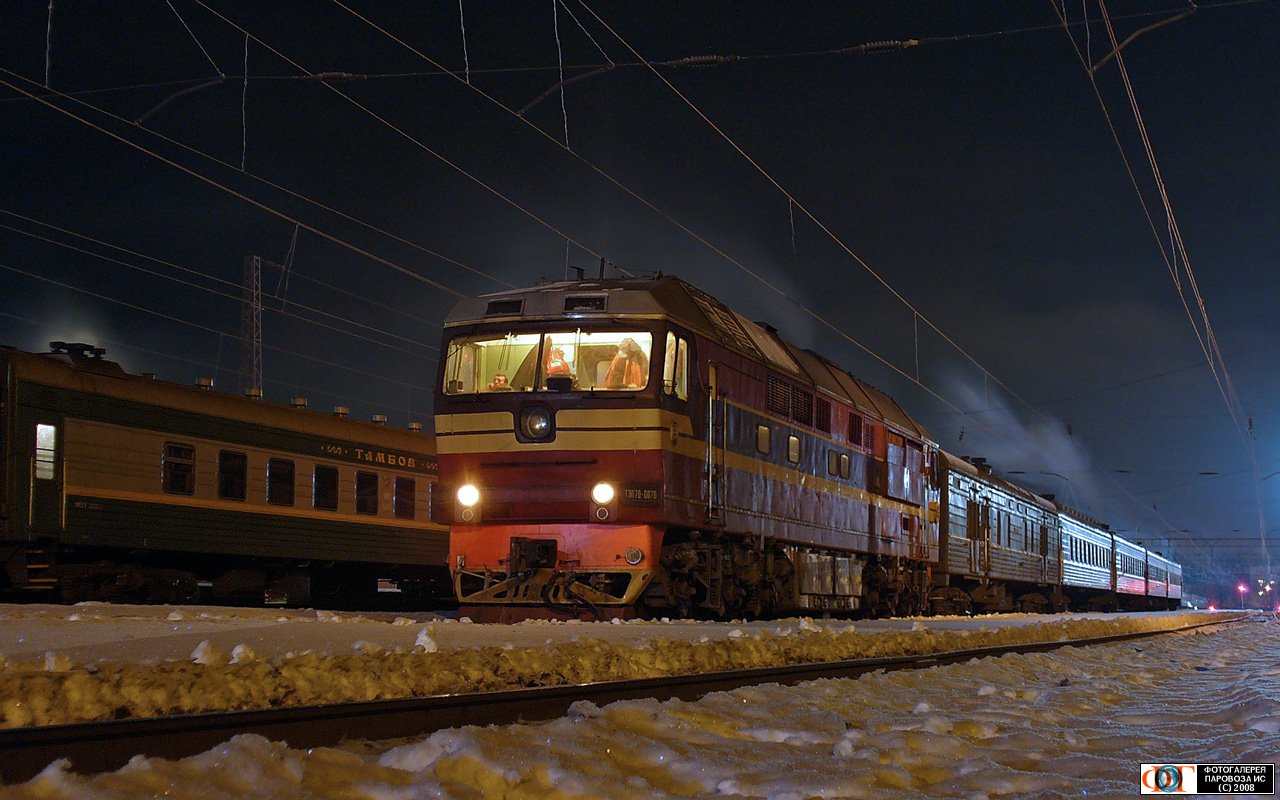 | Тепловоз ТЭП70-0070 с поездом, ст. Мичуринск-Уральский, Тамбовская обл. Автор: Арефьев В. | Фото сделано 10.II.2008, опубликовано 18.III.2008.