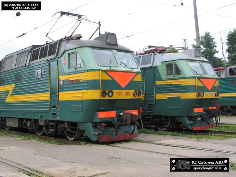 | Электровозы ЧС7-283 и ЧС7-162 { ChS7-283 and ChS7-162 electric locomotives }, депо Москва-Пассажирская-Курская (ТЧ-1), Москва Автор: = SapfiR = | Фото сделано 26.VI.2004, опубликовано 19.IV.2005.