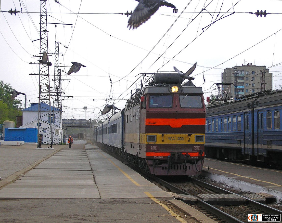 | Электровоз ЧС4Т-300 с поездом "Буревестник", ст. Ковров-I, Владимирская обл. Автор: Pifon | Фото сделано 10.V.2008, опубликовано 27.V.2008.