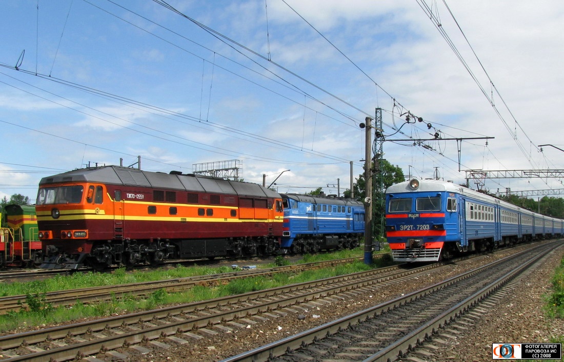 | Тепловозы ТЭП70-0559 и 2ТЭ10УТ-0011 и электропоезд ЭР2Т-7203, ст. Александров I, Владимирская обл. Автор: Wolzow | Фото сделано 31.V.2008, опубликовано 8.VI.2008.