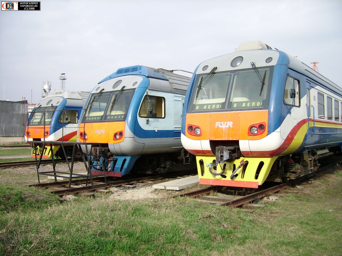 | Дизель-поезда ДР1Б-508, ДР1Б-501, ДР1-510 в депо Гомель, Гомельская обл. Автор: Сергей76 | Фото сделано 4.IV.2008, опубликовано 21.VI.2008.