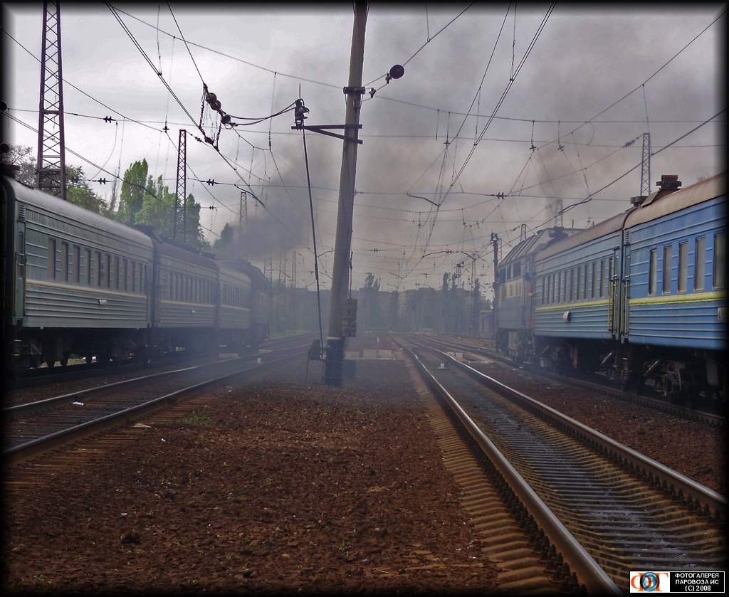 | "Гонки по-харьковски", тепловозы ТЭП70-0080 и ТЭП70-0144, ст. Харьков-Пассажирский, Харьковская обл. Автор: Прикарпатский партизан | Фото сделано 3.V.2008, опубликовано 27.VI.2008.