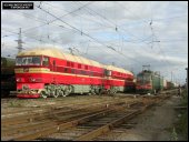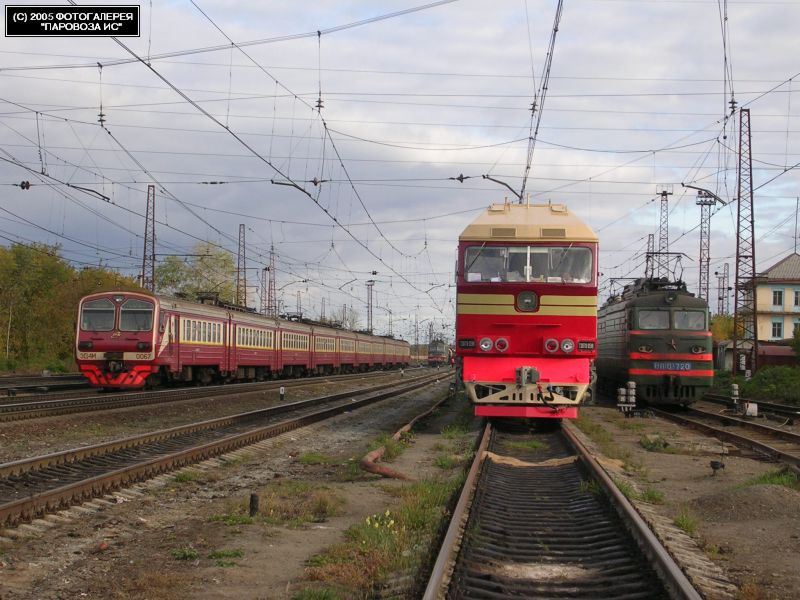 | Тепловоз ТЭП70, электровоз ВЛ10У-720 и примкнувший к ним электропоезд ЭД4М-0067 { A TEP70, a VL10U-720, and an ED4M-0067 }, ст. Голутвин { Golutvin station }, Московская обл. Автор: Колин А. | Фото сделано 5.X.2004, опубликовано 2.VI.2005.