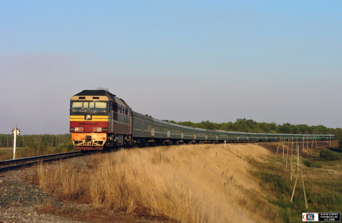 | Тепловоз ТЭП70-0502 с поездом, перегон Оборона - Добринка, Тамбовская обл. Автор: Арефьев В. | Фото сделано 7.IX.2008, опубликовано 17.X.2008.