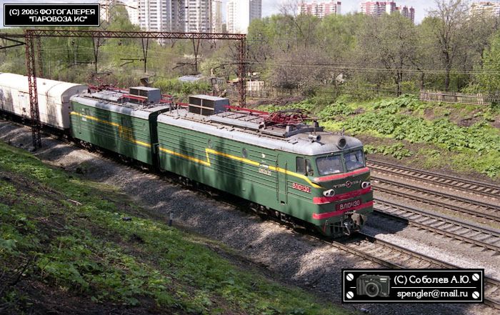 | Электровоз ВЛ10У-130 { VL10U-130 electric locomotive }, перегон Битца - Бутово { Bittsa - Butovo stretch }, Москва Автор: = SapfiR = | Фото сделано 15.V.2005, опубликовано 30.VI.2005.
