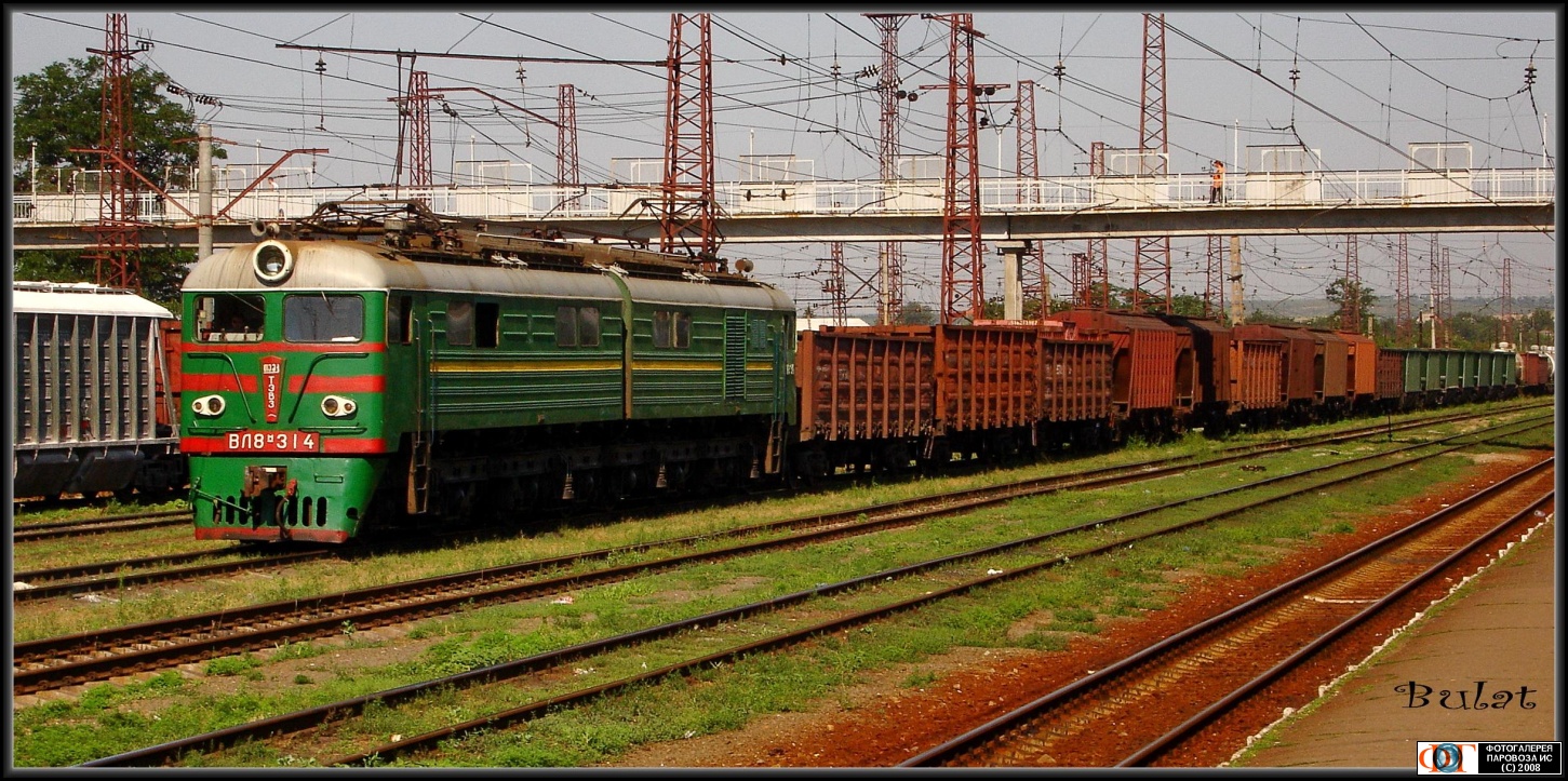 | Электровоз ВЛ8М-314 с грузовым составом минует станцию Славянск, Донецкая обл. Автор: Bulat | Фото сделано 23.VII.2008, опубликовано 26.XI.2008.