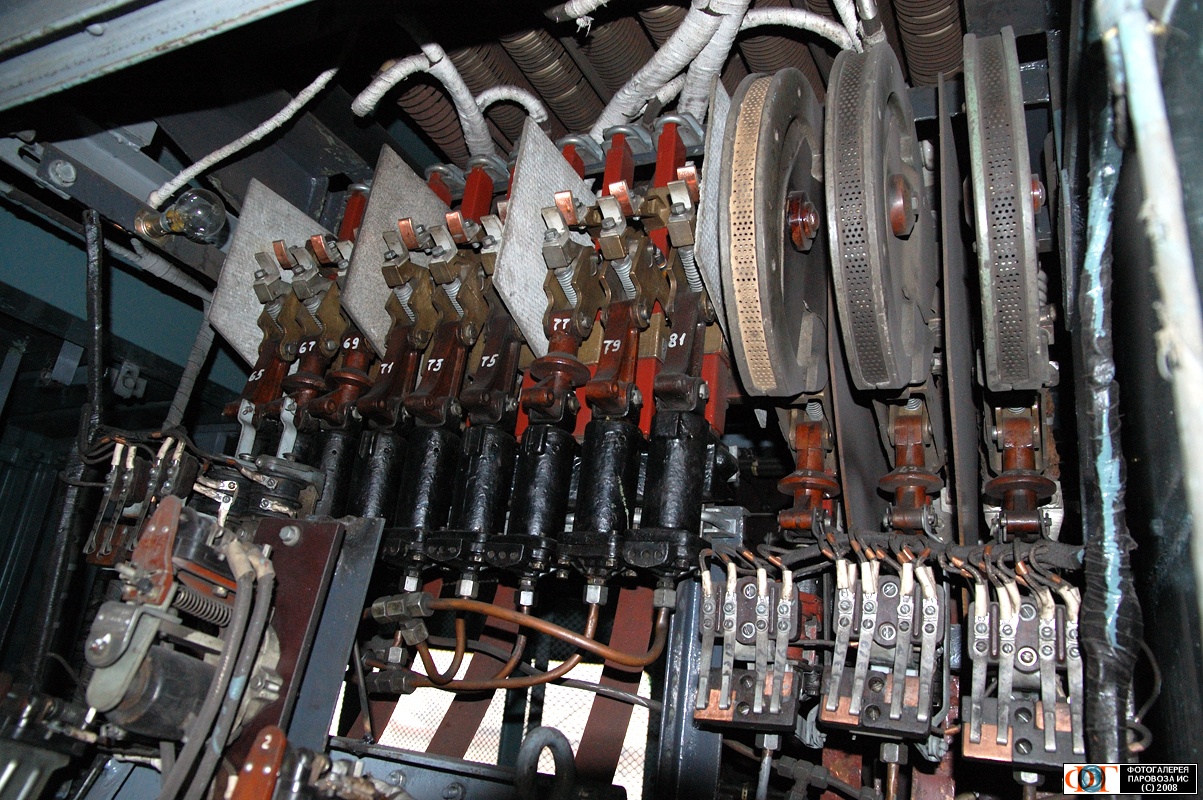 ] Разница лишь в том, что там контакторы ослабления возбуждения разобраны, линейных контакторов нет (на ВЛ80Р их почти (!) нет), а также в глобальных различиях компоновки и характеристик ВЛ80 и ВЛ60. Из-за несколько меньшей мощности и гораздо большего номинального напряжения тяговых двигателей их токи меньше, чем на ВЛ80, что позволило выполнить контакторы ослабления поля безо всякого дугогашения, как на тепловозах - а на ВЛ80 дугогасительные камеры только на контакторах первой ступени ОВ. ====#====#==== ====#====#==== Каждая группа из трёх отгороженных контакторов - для одного двигателя, по трубкам к приводам подводится воздух от общих для всех контакторов блока вентилей, два вентиля из трёх выглядывают из-за реле боксования - чёрные катушки. В этом, кстати, ещё одно глобальное отличие, только уже между ВЛ и ЧС - на ВЛ переменного тока в кучки собраны контакторы для одного двигателя, а на ЧС переменного тока контакторы одной ступени, они имеют общий цилиндр привода. Образно говоря, строки поменяли местами со столбцами. При общей генеральной линии переменники от НЭВЗ и Skoda отличаются так сильно, что диву даёшься... ====#====#==== ====#====#==== Три контактора справа имеют дугогасительные камеры, потому что разрывают большой ток - это линейные контакторы. Все контакторы на фото пронумерованы, поэтому любой желающий, достав схему ВЛ60К (хотя бы на railbook.net [ ] ), может посмотреть их место в схеме. Остаётся лишь сказать, что таких блоков на электровозе два, по числу тележек -- Vivan755 ,