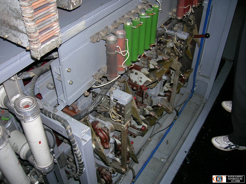 > > Сложные аппараты с трапециевидными ножами – реверсор и один из двух переключателей «Ход-Тормоз», второй «Х-Т» секции стоит ближе к концу высоковольтной камеры на одной линии с этими, если отойти на два метра по проходу назад и сделать такой же кадр, то он будет виден. По конструкции они одинаковы и имеют поворотные контактные ножи (верхние, они отлично видны на фото, и нижние) и по два неподвижных контакта для каждого ножа