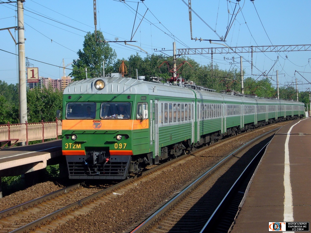 | Электропоезд ЭТ2М-097 прибывает на пл. Сортировочная Окт. ж.д., Санкт-Петербург Автор: А.Р. | Фото сделано 5.VI.2007, опубликовано 29.I.2009.