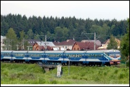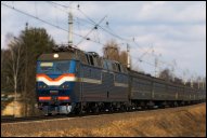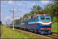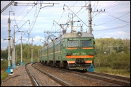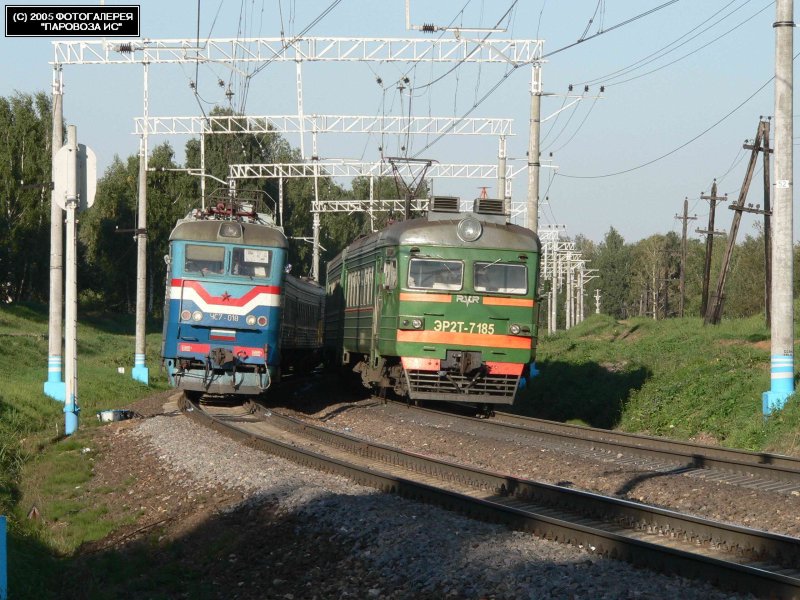 | Электровоз ЧС7-018 и электропоезд ЭР2Т-7185 идут навстречу друг другу { ChS7-018 electric locomotive and ER2T-7185 EMU train going in opposite directions }, участок Кокошкино - Крёкшино { Kokoshkino - Krekshino stretch }, Московская обл. Автор: Ронис Д. | Фото сделано 26.VIII.2005, опубликовано 14.IX.2005.