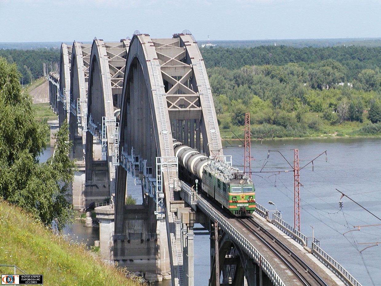 | Электровоз ВЛ80С-1309 с грузовым составом на мосту через р. Ока, перегон Петряевка - Окская, Нижегородская обл. Автор: Gekko | Фото сделано 1.VIII.2009, опубликовано 8.VIII.2009.