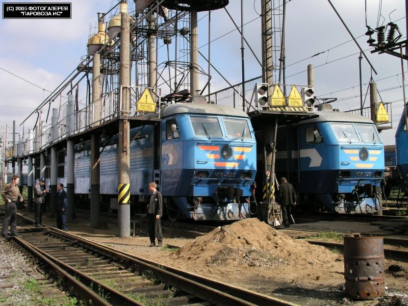 | Электровозы ЧС6-020 и ЧС6-025 на экипировке { ChS6-020 and ChS6-025 electric locomotives }, депо СПб.-Главный { St.-P.-Glavny shed }, Санкт-Петербург Автор: Pampers | Фото сделано 200?, опубликовано до 03.VIII.2001.