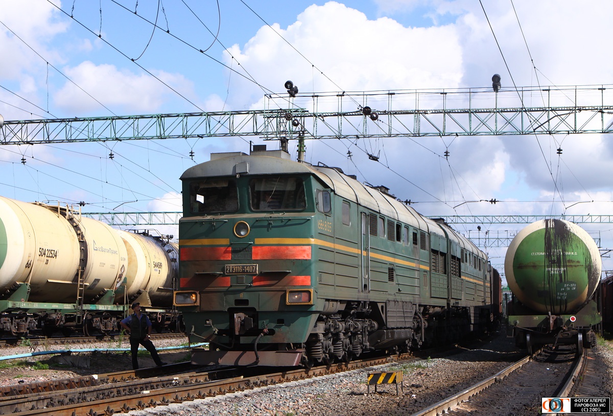 | Тепловоз 2ТЭ116-1407 с грузовым составом, перед отправкой на Ржев, станция Волоколамск, Московская обл. Автор: Дмитрий Зю. | Фото сделано 29.VIII.2009, опубликовано 6.IX.2009.