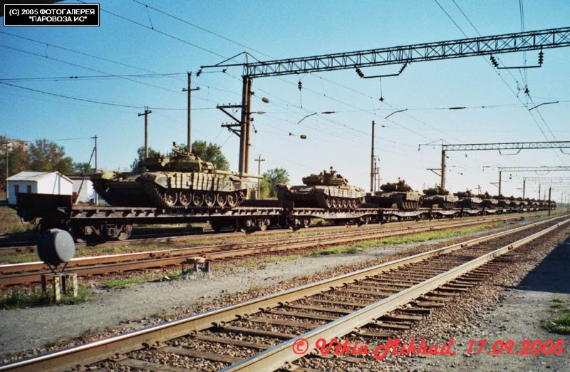 | Состав платформ с танками { Tanks on flatcars }, ст. Жана-Караганды { Zhana-Karagandy station }, Карагандинская область Автор: Уткин Михаил † | Фото сделано 17.IX.2005, опубликовано 13.X.2005.