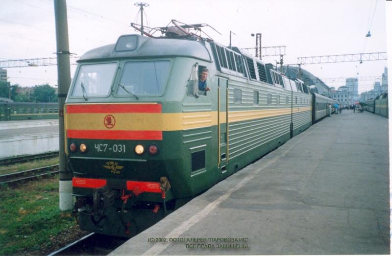 | Электровоз ЧС7-031 { ChS7-031 electric locomotive }, Киевский вокзал { Kievsky terminal }, Москва Автор: 389 | Фото сделано ????, опубликовано до 03.VIII.2001.