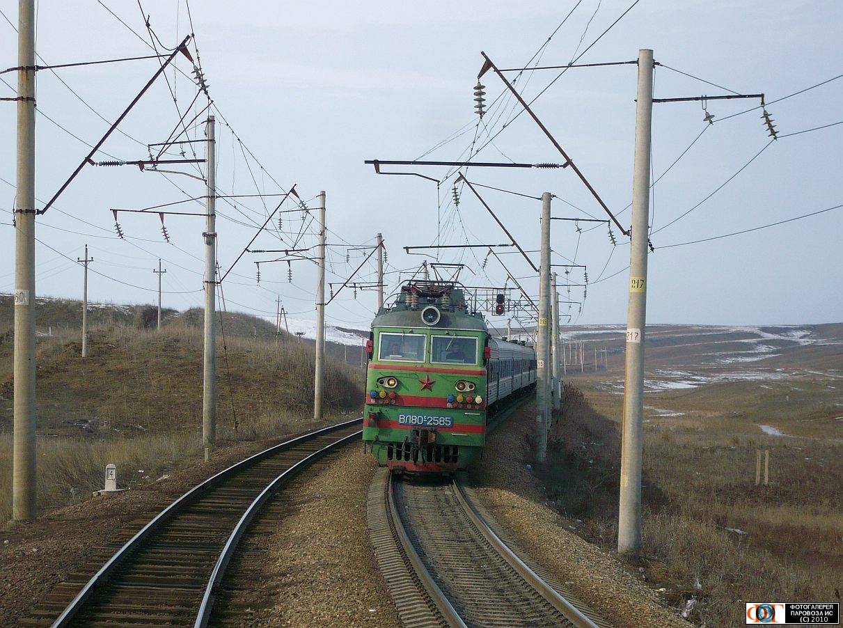 | Электровоз ВЛ80С-2585 с поездом №10 Астана - Алматы на перегоне блок-пост 4020 км - Чемолган, Алма-Атинская область Автор: Aleks28 | Фото сделано 8.III.2010, опубликовано 24.III.2010.