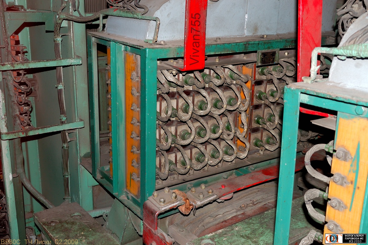 - Над другой тележкой аналогичная система — два шкафа выпрямительной установки, реактор, патрубки к трансформатору. А на этом снимке за шкафом слева ещё виднеется правая задняя форкамера [