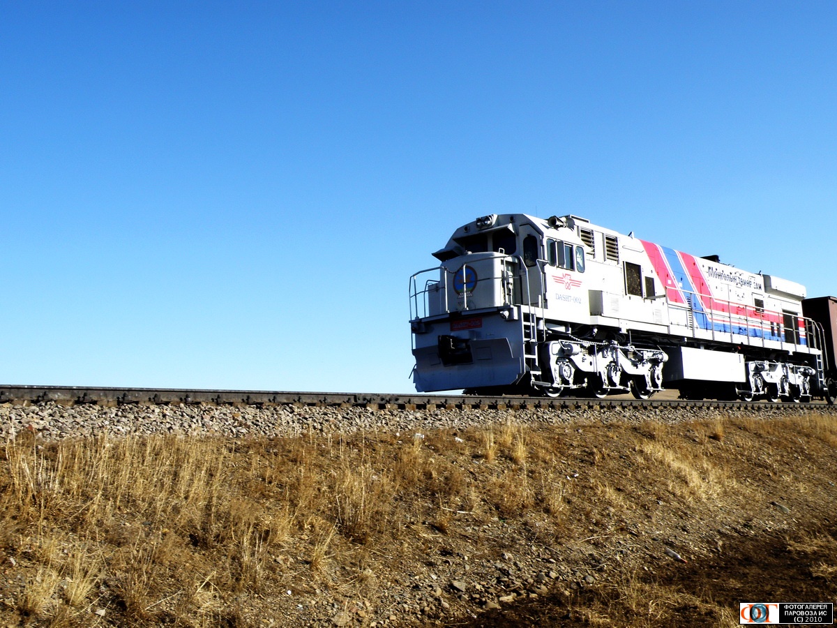 Тепловоз DASH7-002 с грузовым поездом на перегоне Хайрхан - Баян