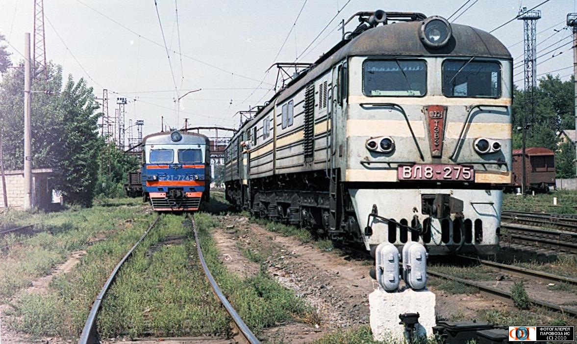 | Электропоезд ЭР2Т-7249 и электровоз ВЛ8М-275, ст. Синельниково-I, Днепропетровская обл. Автор: Фёдор Яшин† | Фото сделано VIII.1998, опубликовано 29.V.2010.