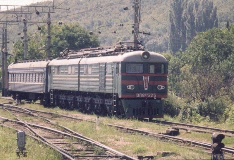 | Электровоз ВЛ8М-525 { VL8M-525 electric locomotive }, станция Инкерман-2 { Inkerman-2 station }, Севастополь Автор: Павел Дунаев | Фото сделано VIII.2003, опубликовано 17.X.2003.