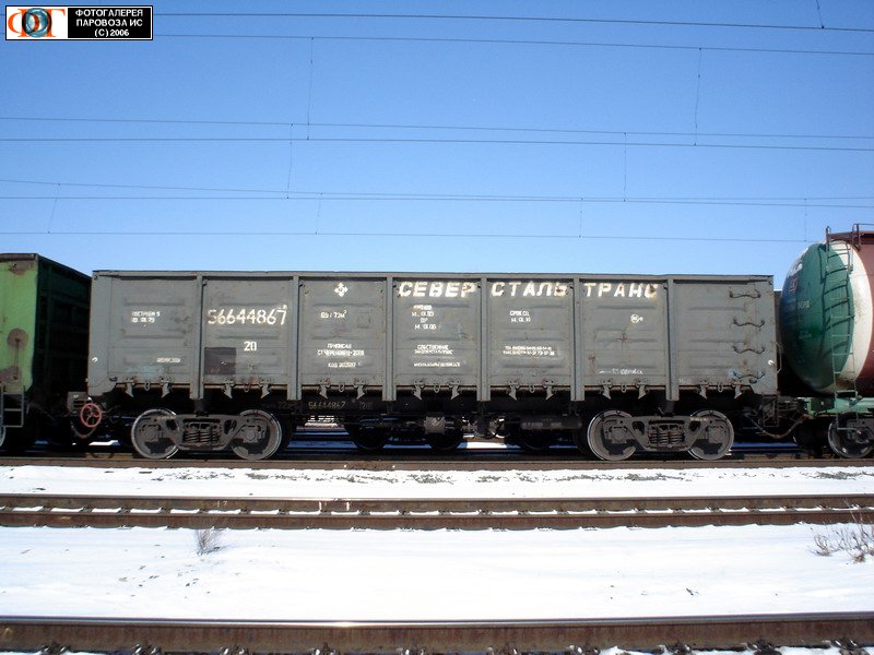 | Полувагон компании "СеверСтальТранс" { SeverStalTrans gondola car }, ст. Шпалопропитка { Shpalopropitka station }, Волгоградская обл. Автор: DM_Vlg | Фото сделано 12.III.2005, опубликовано 19.I.2006.