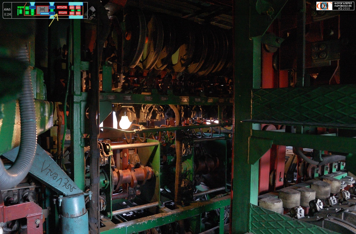 - Лампой освещён переключателей вентилей (схемный номер 48), переключающий высоковольтную схему на питание либо от пантографа и токосъёмников колёсных пар (постоянный ток), либо от выпрямительной установки. Над ним реостатные и линейные контакторы, справа от него аварийные переключатели двигателей ПД1, ПД2, подробнее под этим снимком [