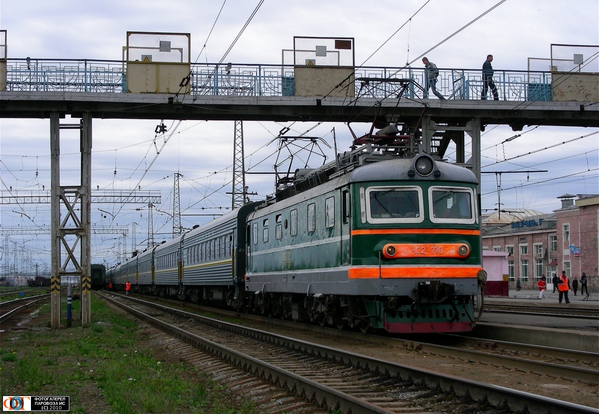 | Электровоз ЧС2-710 с фирменным поездом "Енисей" Москва - Красноярск на ст. Пермь-II, Пермский край Автор: Ирина | Фото сделано 1.VI.2009, опубликовано 27.XII.2010.