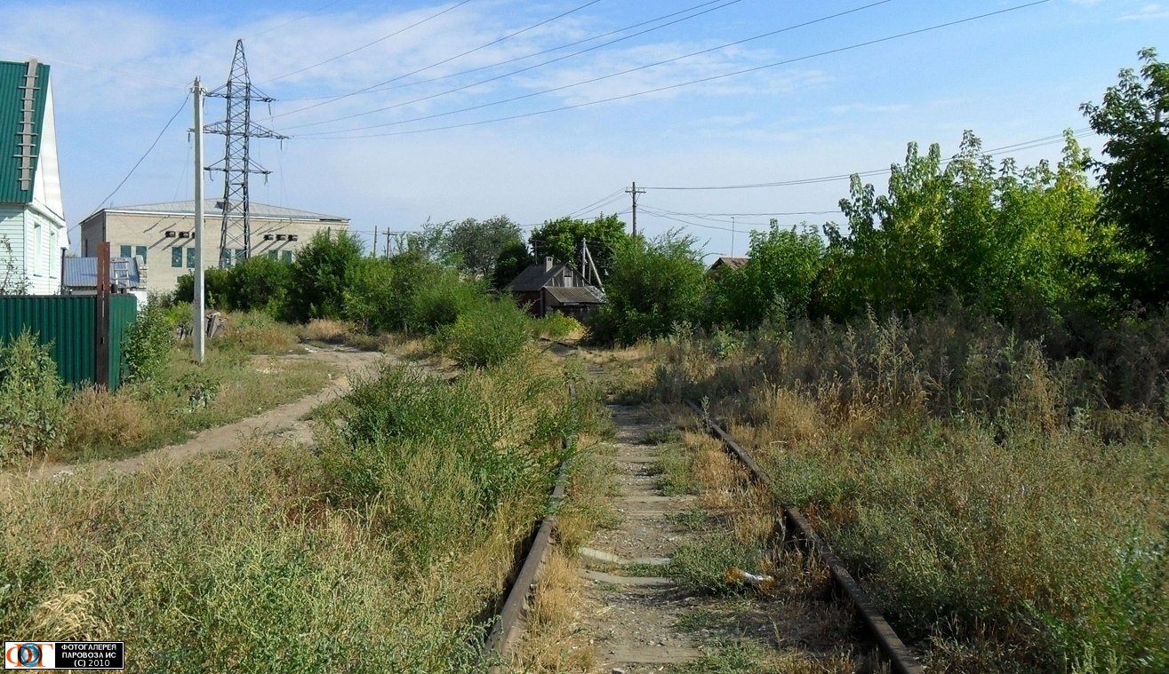 - Путь этот отходит от тупиковых погрузочных путей элеватора и идёт через частный сектор города на мукомольный завод. Ветка пересекает 4 улицы и имеет один переезд без шлакбаума. По обоим сторонам от переезда, на пути стоят светофоры, давно не работают, как и сам путь. Мукомольный завод фактически перестал выполнять свои функции примерно 5 лет назад, с тех пор движения туда нет, путь порос кустами. При жизни завода, туда часто подавали составы под погрузку. Здание в кадре - городская подстанция. -- Артём из Пугачёва