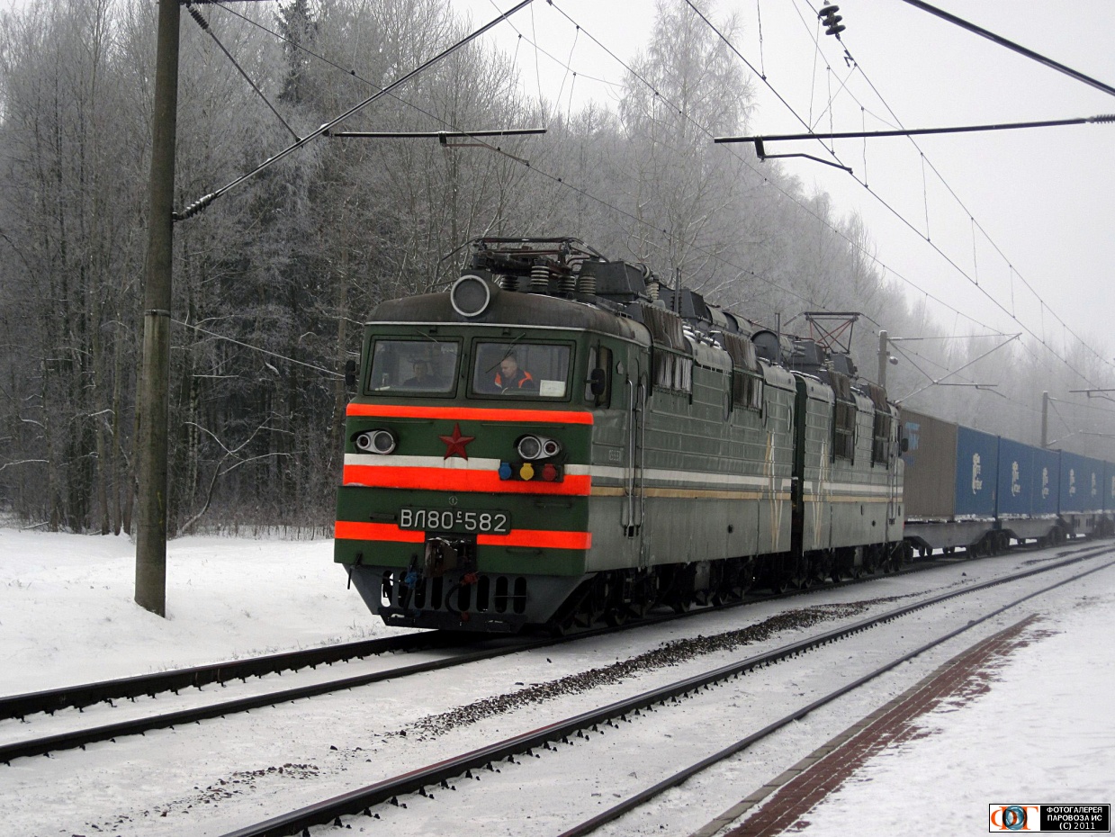 | Электровоз ВЛ80С-582 с транс-контейнерным поездом на перегоне Минск-Сортировочный - Помыслище, Минская обл. Автор: PAShA | Фото сделано 5.XII.2010, опубликовано 15.I.2011.