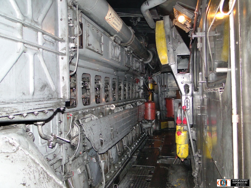 | Дизельное помещение тепловоза 2ТЭ10У-0143 (секция Б), локомотивное депо Гомель, Гомельская обл. Автор: oleg-BY | Фото сделано 9.XII.2010, опубликовано 16.I.2011.