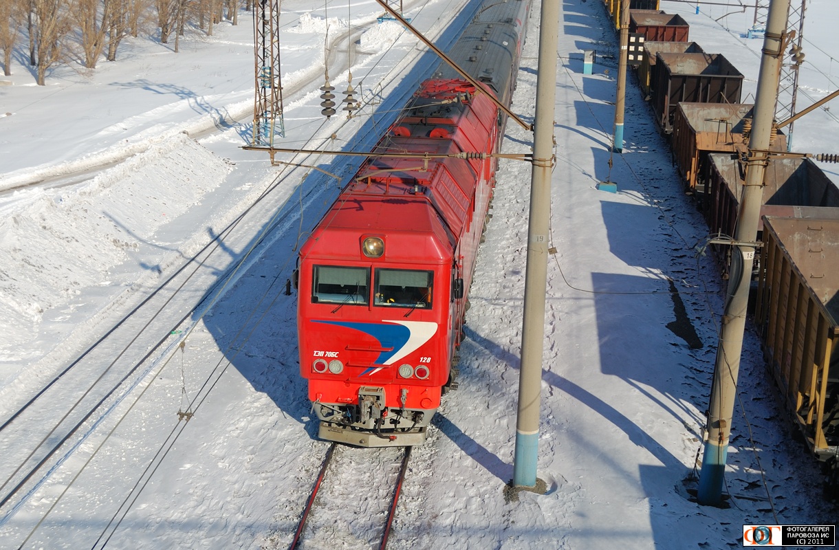 | Тепловоз ТЭП70БС-128 с поездом №141, чётная горловина ст. Кряж, Самарская обл. Автор: Vivan755 | Фото сделано 27.II.2011, опубликовано 28.II.2011.