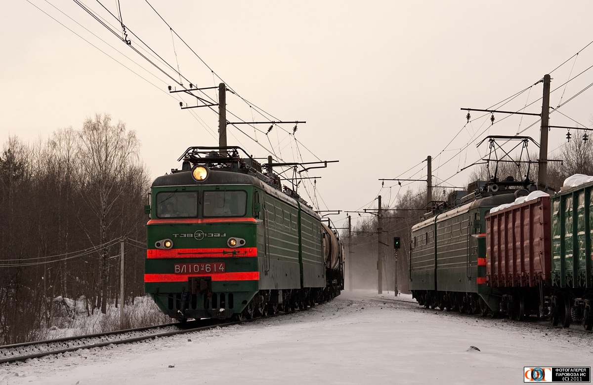 | Электровоз ВЛ10У-614 с грузовым поездом, перегон Мга - Назия, Ленинградская обл. Автор: electron | Фото сделано 7.III.2011, опубликовано 20.III.2011.