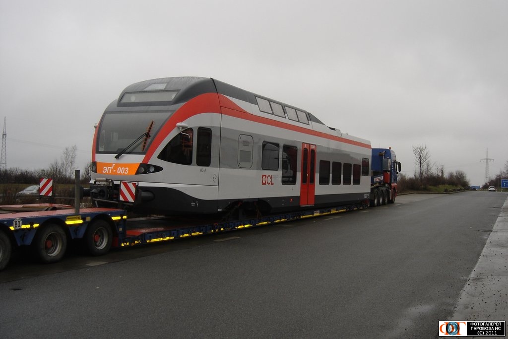 | Кузов головной секции электропоезда ЭПГ-003 в процессе транспортировки. Паркинг "Дрезднер тор" (10 км от Дрездена), Германия Автор: М.Шварц | Фото сделано 18.III.2011, опубликовано 25.III.2011.