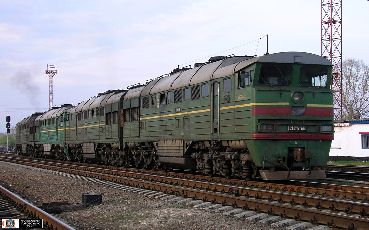 | Тепловоз 2ТЭ116-616 в сплотке с другим 2ТЭ116 на станции Полтава-Южная, Полтавская обл. Автор: Алексей Краснов | Фото сделано 21.IV.2006, опубликовано 11.V.2011.