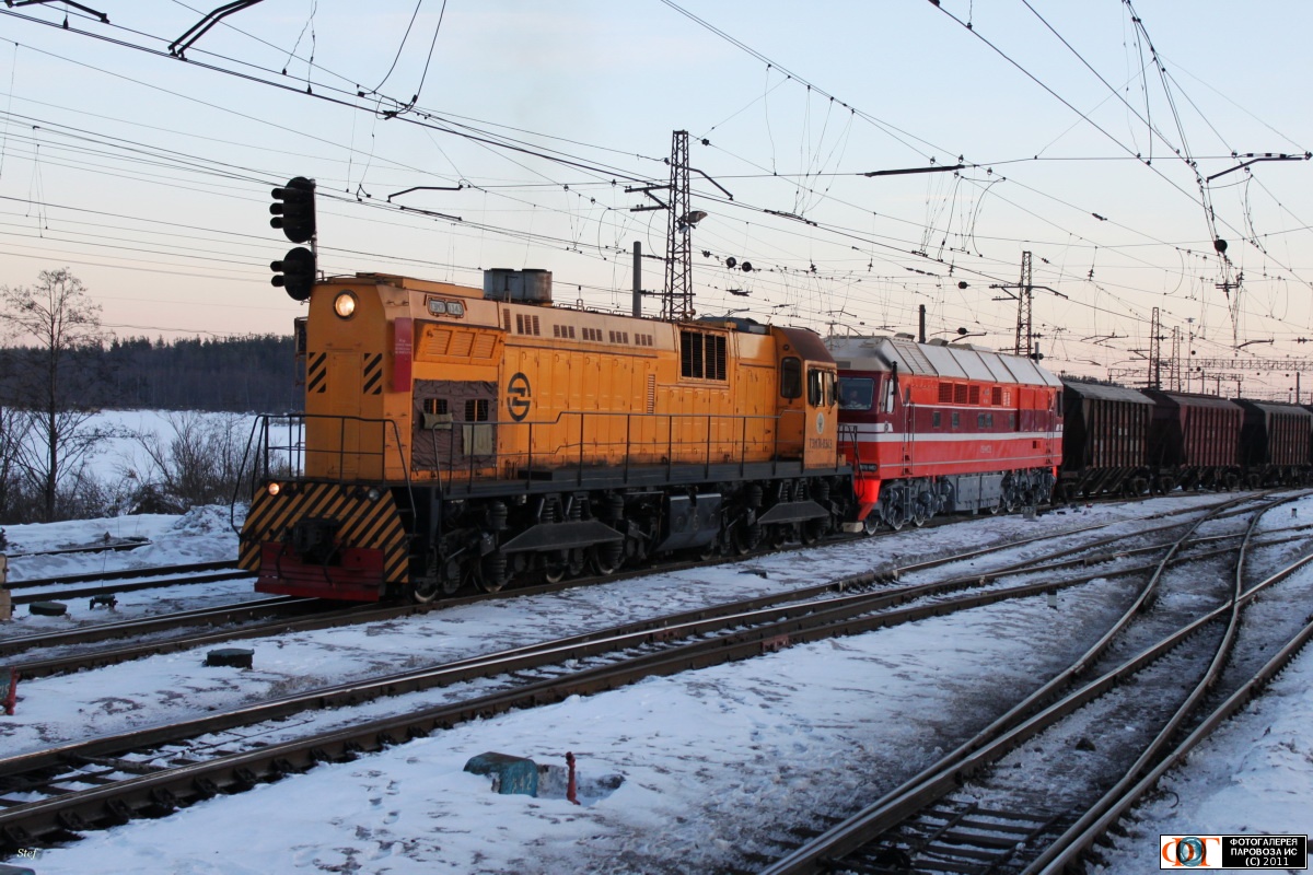 | Тепловоз ТЭМ7А-0343 с грузовым поездом и перегоняемым тепловозом ТЭП70-0403 на станции Орехово-Зуево, Московская обл. Автор: Stef | Фото сделано 8.III.2011, опубликовано 23.V.2011.