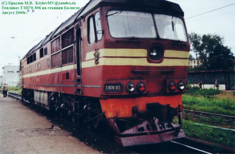 | Тепловоз ТЭП70-0306 { TEP70-0306 diesel locomotive }, Бологое-Моск. { Bologoe-Mosk. }, Тверская обл. Автор: Крылов М. В. | Фото сделано VIII.2000, опубликовано 17.XII.2001.