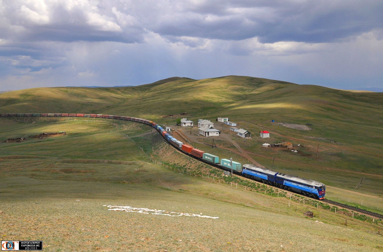 Тепловоз 2ТЭ116УМ с грузовым поездом заходит на ст. Хоолт со стороны ст. Баян