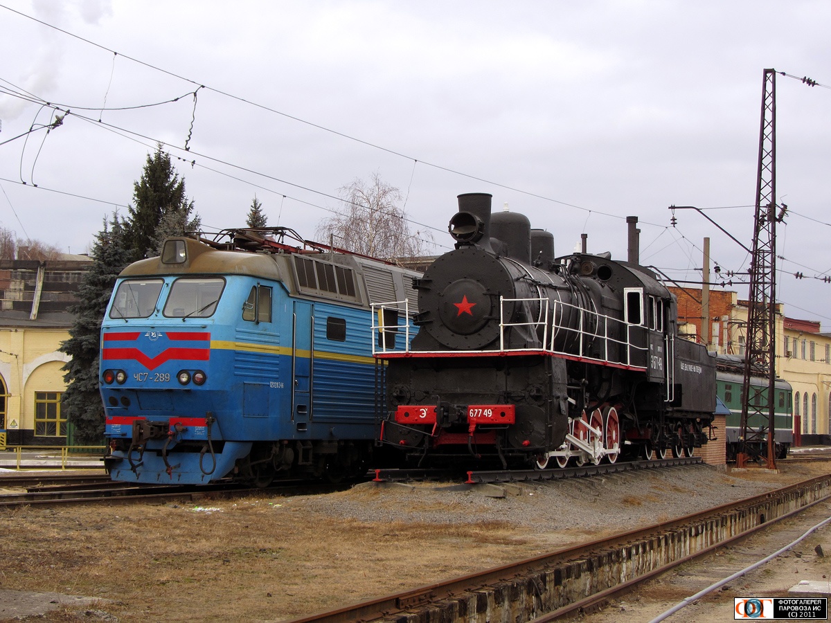 | Паровоз Эу677-49 и электровоз ЧС7-289 в депо "Октябрь" (ТЧ-2) ЮЖД, Харьковская обл. Автор: Алексей Краснов | Фото сделано 25.XI.2011, опубликовано 3.XII.2011.